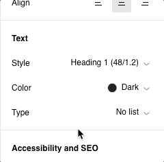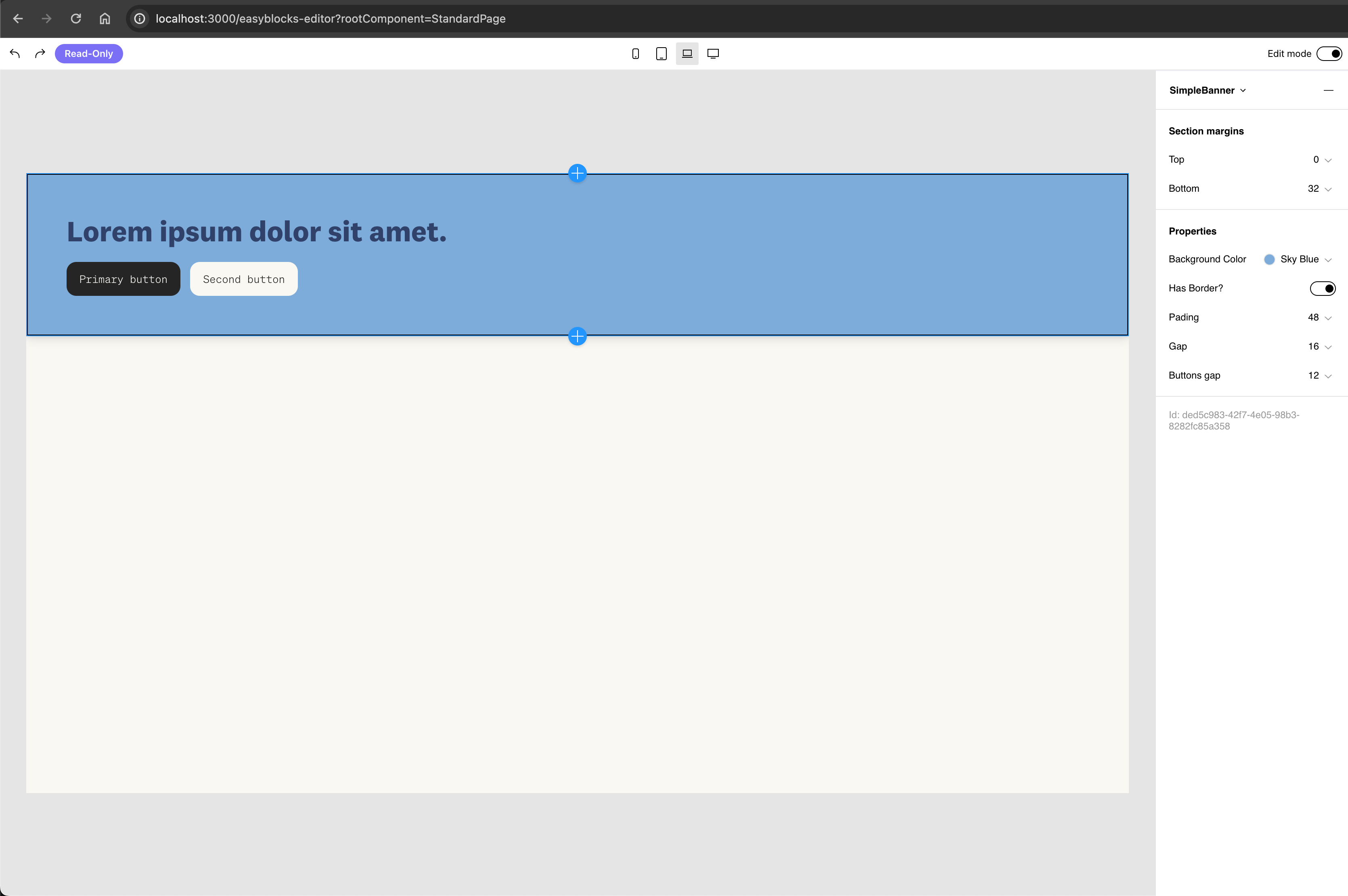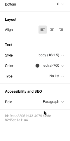Basic properties are displayed in the sidebar when the component is selected (it's a default behaviour but it can be overridden via [editing function](https://docs.easyblocks.io/essentials/no-code-components/editing-function)).