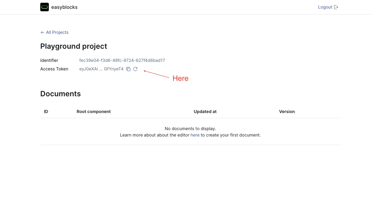 Easyblocks configuration object requires a `backend` property. Backend is responsible for handling documents and templates saving, updating, versioning etc. The easiest way to start is to use our simple and free cloud service. Just go to <https://app.easyblocks.io>, create the account, go to the "Playground project", copy your access token: